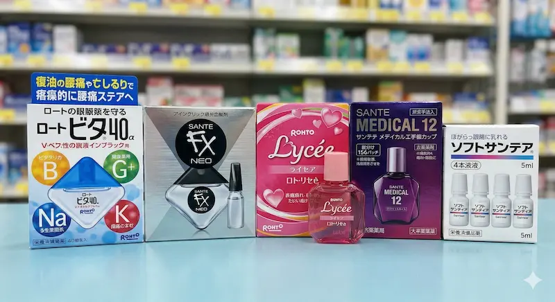 | 산테 메디컬 12 | 산텐 | 안약 중 최고급 라인. 12가지 유효 성분으로 극심한 피로 개선 | 1,400엔 ~ 1,600엔 |