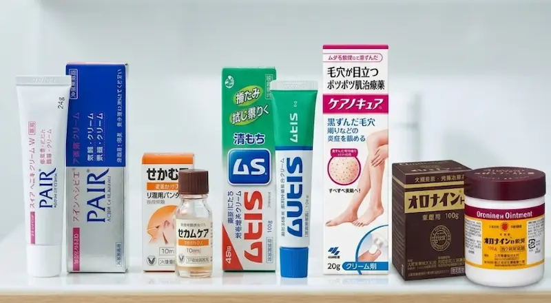 왼쪽부터: 페어 아크네 (Pair), 사카무케아, 무히 (Muhi) S, 케어노큐어, 오로나인 H 연고